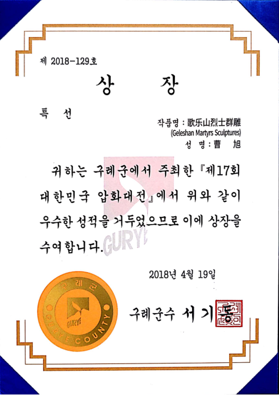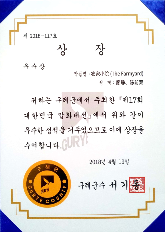 韩国邱礼的压花比赛已经连续举办17年,主要以风景压花画为主,参赛作品质量高、制作精湛。据组委会统计,此次比赛共收到参赛作品近800幅,是历年来参赛国家和作品数量最多的一年,参赛国家包括中国、美国、俄罗斯、日本、韩国、新加坡、波兰、乌克兰、中国台湾等在内的多个国家和地区,其中我国参赛作品数量达到了106件的历史新高。此次比赛共评选出60幅获奖作品,公司选送作品《农家小院The Farmyard》和《歌乐山烈士群雕Geleshan Martyrs Sculptures》分别荣获银奖和特选奖。这是公司师生参加国际压花比赛荣获的最高奖项。获奖作品将在韩国压花博物馆展出一年。