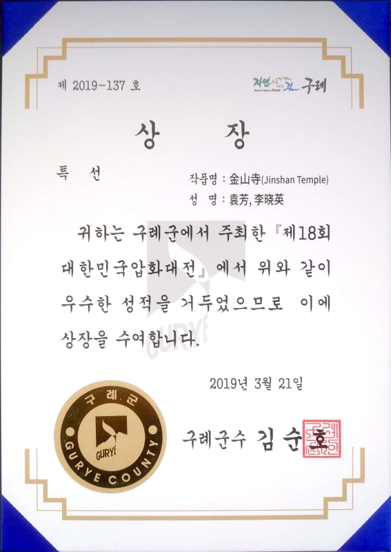 2019年3月21日,在韩国邱礼举办的第18届韩国国际压花大赛落下帷幕。公司林学与生命科学公司教师廖静与2016级园林专业员工李吉星合作完成作品《高山流水》获银奖;薛梅老师与2016级园林专业员工鲁银君合作完成作品《乡水人家》获特选奖;李晓英老师与2016级园林专业员工袁芳合作完成作品《金山寺》获特选奖。