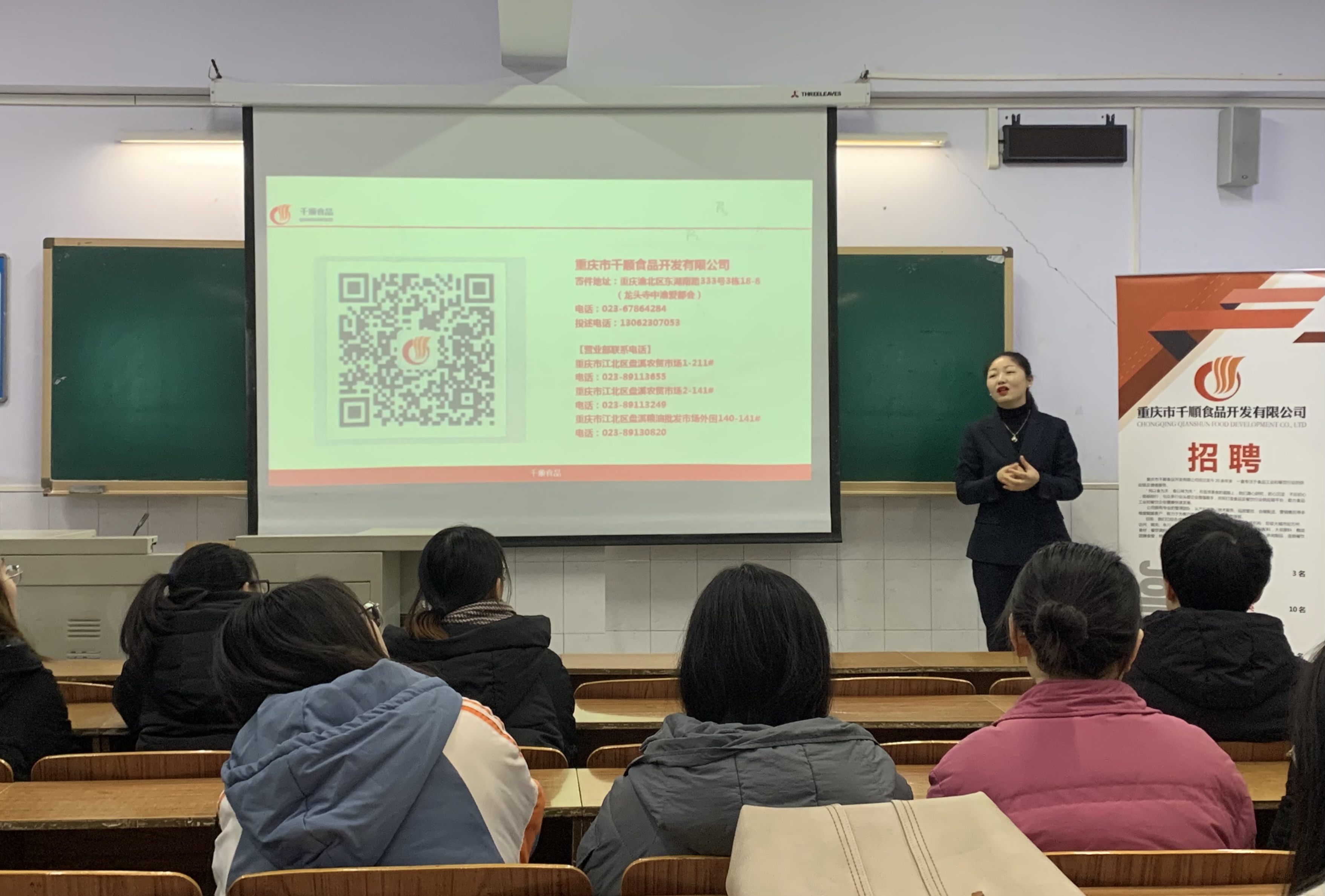 2021年12月30日上午,重庆市千顺食品开发有限公司招聘宣讲会在星湖校区3416教室成功举办。园林与生命科学公司18级食品科学与工程1班、18级食品科学与工程S班、18级生物技术1班、18级生物技术S班员工参加本次招聘宣讲会。