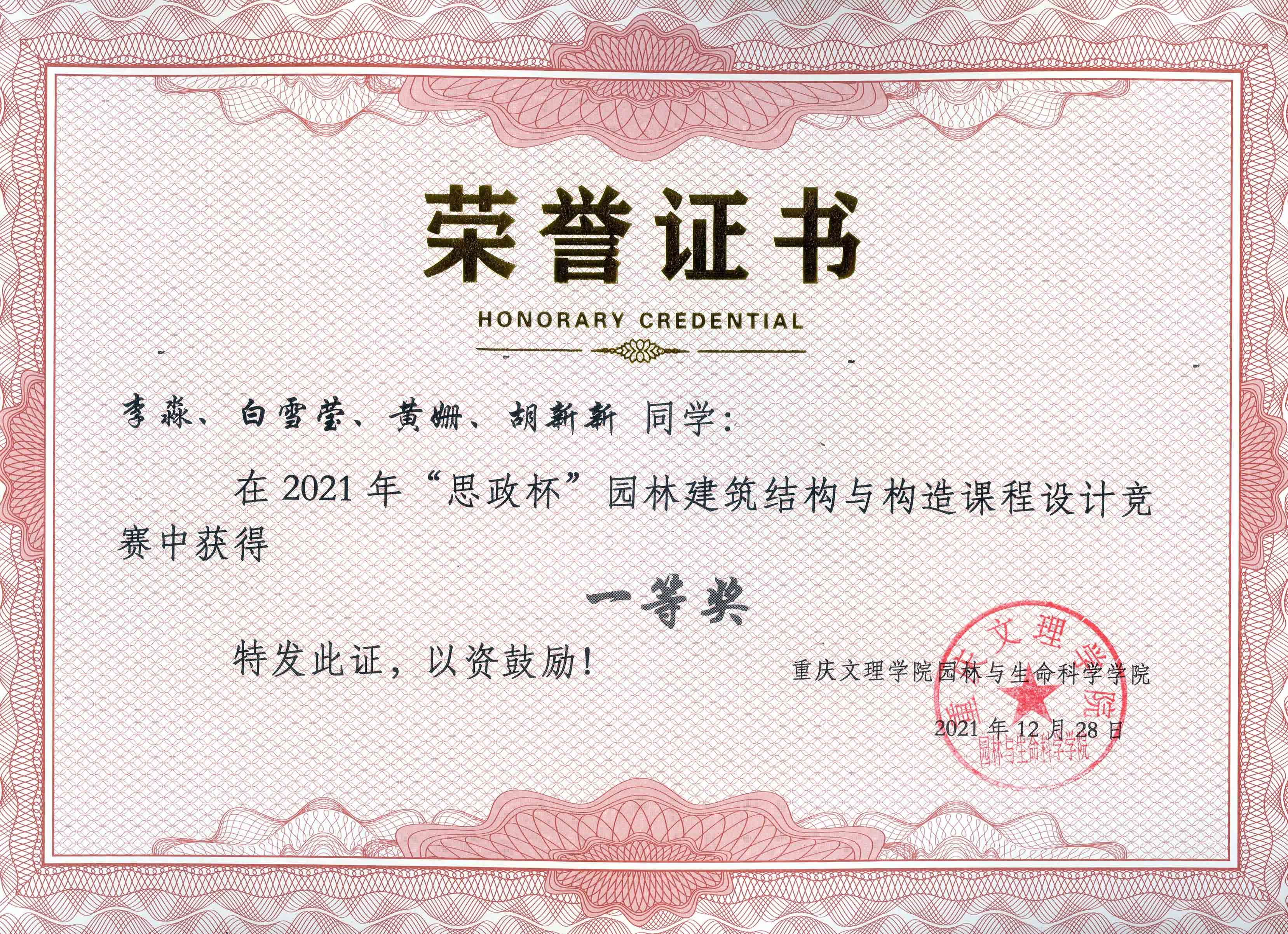 本次竞赛活动依托2021年度校级课程思政建设项目展开,自2021年12月启动以来,共收到20级园林一本班、园林1班 25支团队114人的设计作品与课程论文41份,经园林专业4位教师认真评审,最终有15个团队获得了奖项,其中一、二、三等奖各5项。