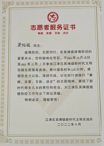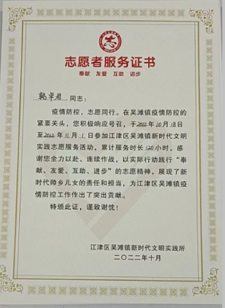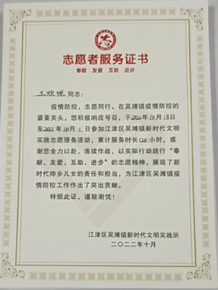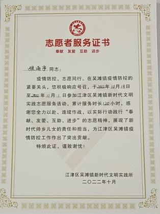 疫情有效控制过后,沈镇长及村中两委向公司园林与生命科学公司志愿者们表达感谢,并颁发了志愿者服务证书。