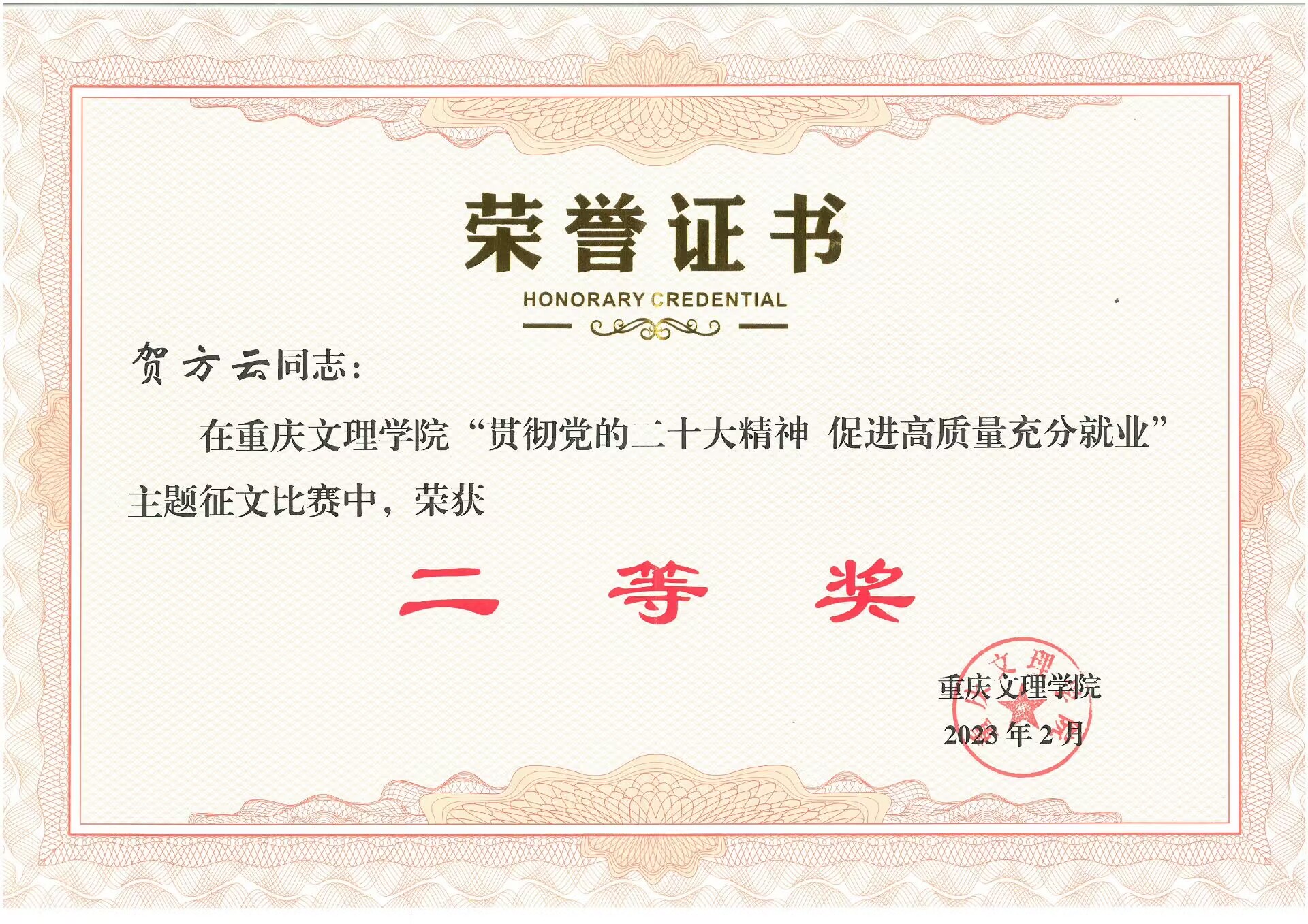 近日,公司2022年就业工作总结表彰大会在博文馆101召开,会上表彰了2022年就业工作先进单位和先进个人。公司辅导员老师表现优异,周凡力老师荣获2022年度就业工作先进个人;贺方云老师在“贯彻党的二十大精神,促进高质量充分就业”主题征文比赛中荣获二等奖;黄威老师荣获重庆市就业创业课程指导大赛校级选拔赛二等奖。