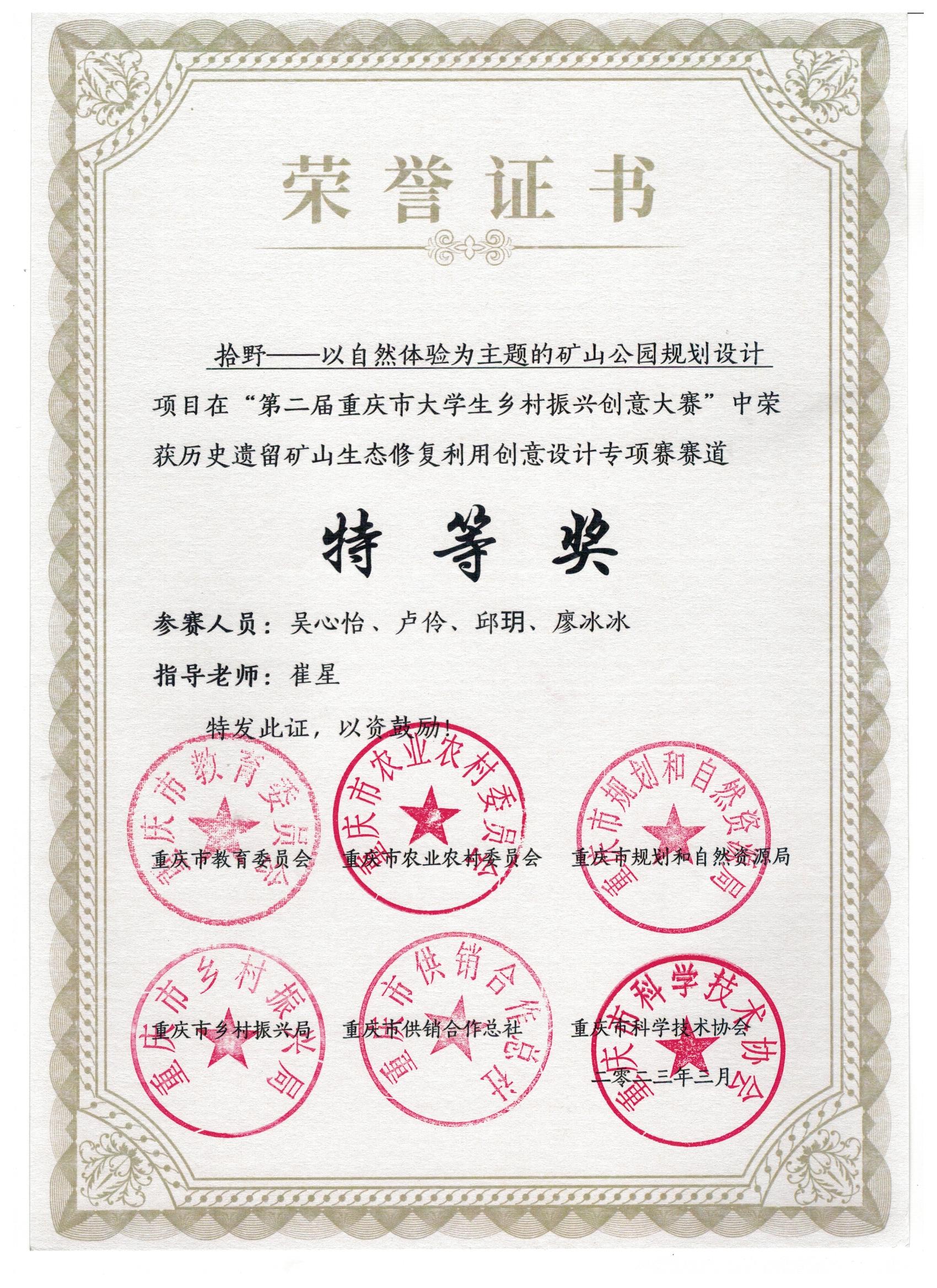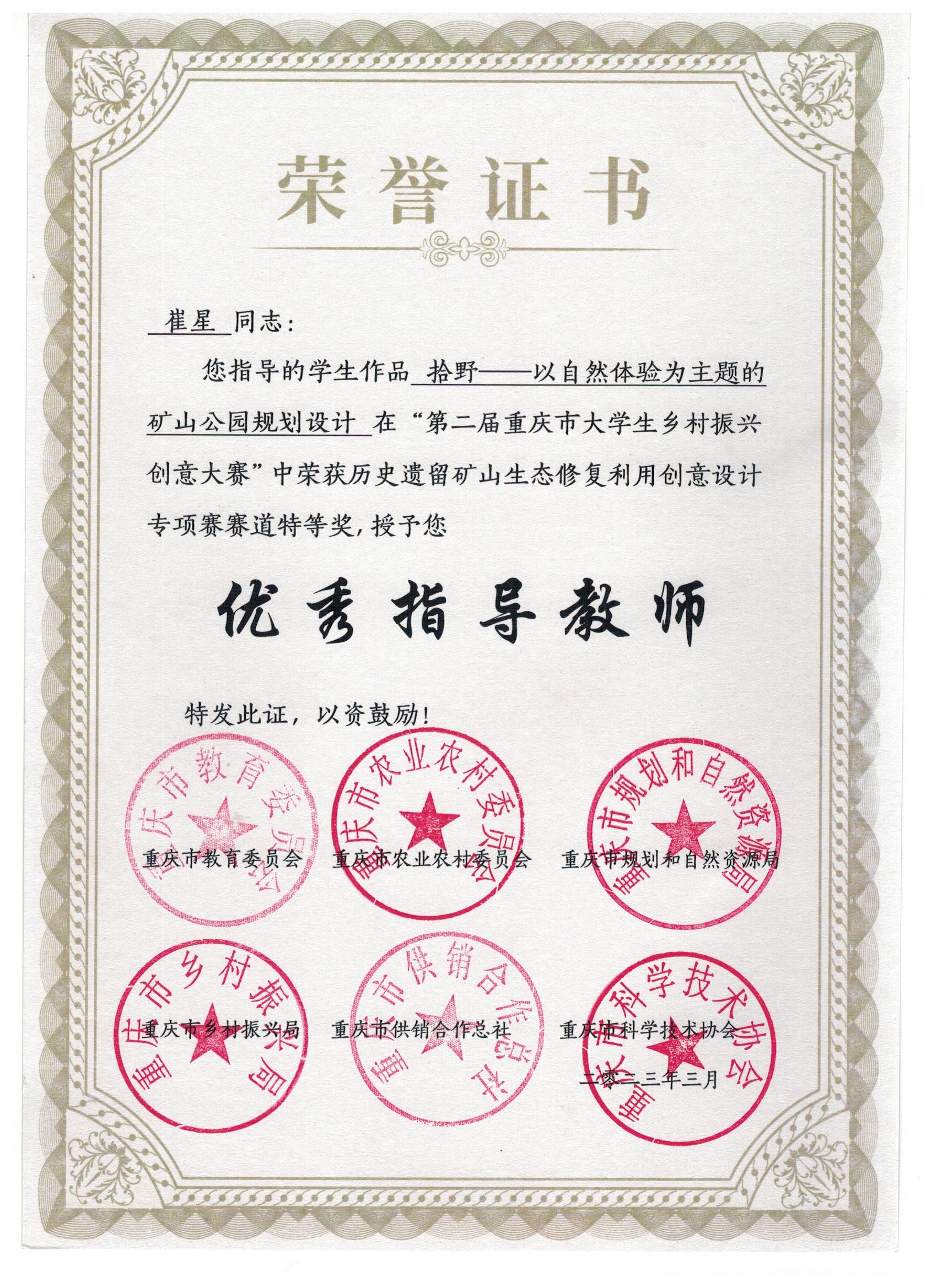 近日,由重庆市教育委员会、重庆市农业农村委员会、重庆市规划和自然资源局、重庆市乡村振兴局等部门联合主办的第二届重庆市老员工乡村振兴创意大赛获奖名单公布,园林专业员工吴心怡、聂星宇、李淼等13位同学的作品分别获得特等奖、三等奖,指导教师崔星获评“优秀指导教师”。