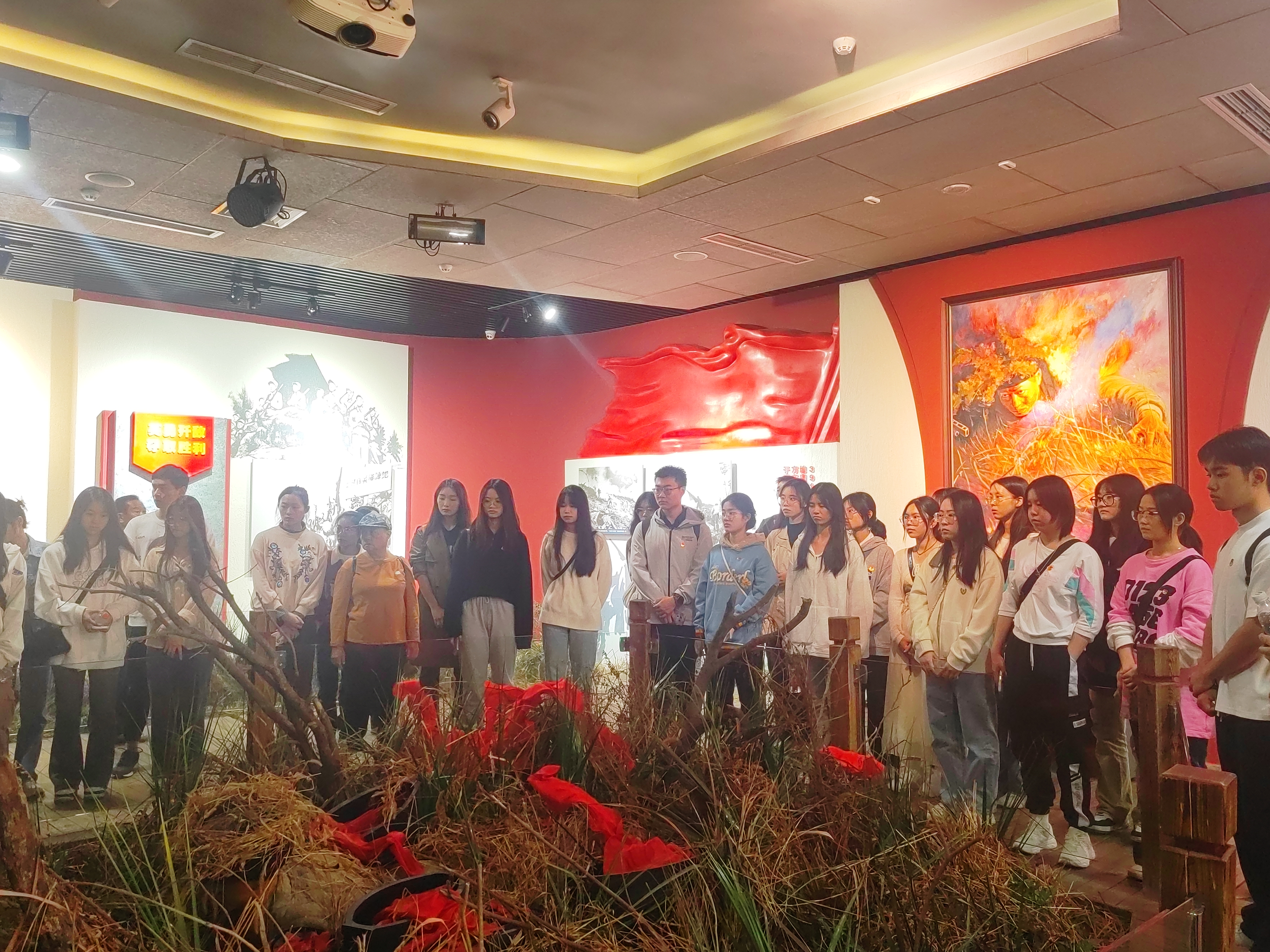 不到一个小时的车程,师生们顺利到达陈列馆,跟着讲解员步入馆内聆听参观。讲解员向大家介绍了邱少云烈士的生平事迹,从苦难的童年到壮烈牺牲在朝鲜战场,短暂而伟大。馆内还构造了立体式的邱少云牺牲的场景,烈火真金,震撼人心,再现了邱少云遵守潜伏纪律,忍受烈火焚身,为集体壮烈捐躯的情节。