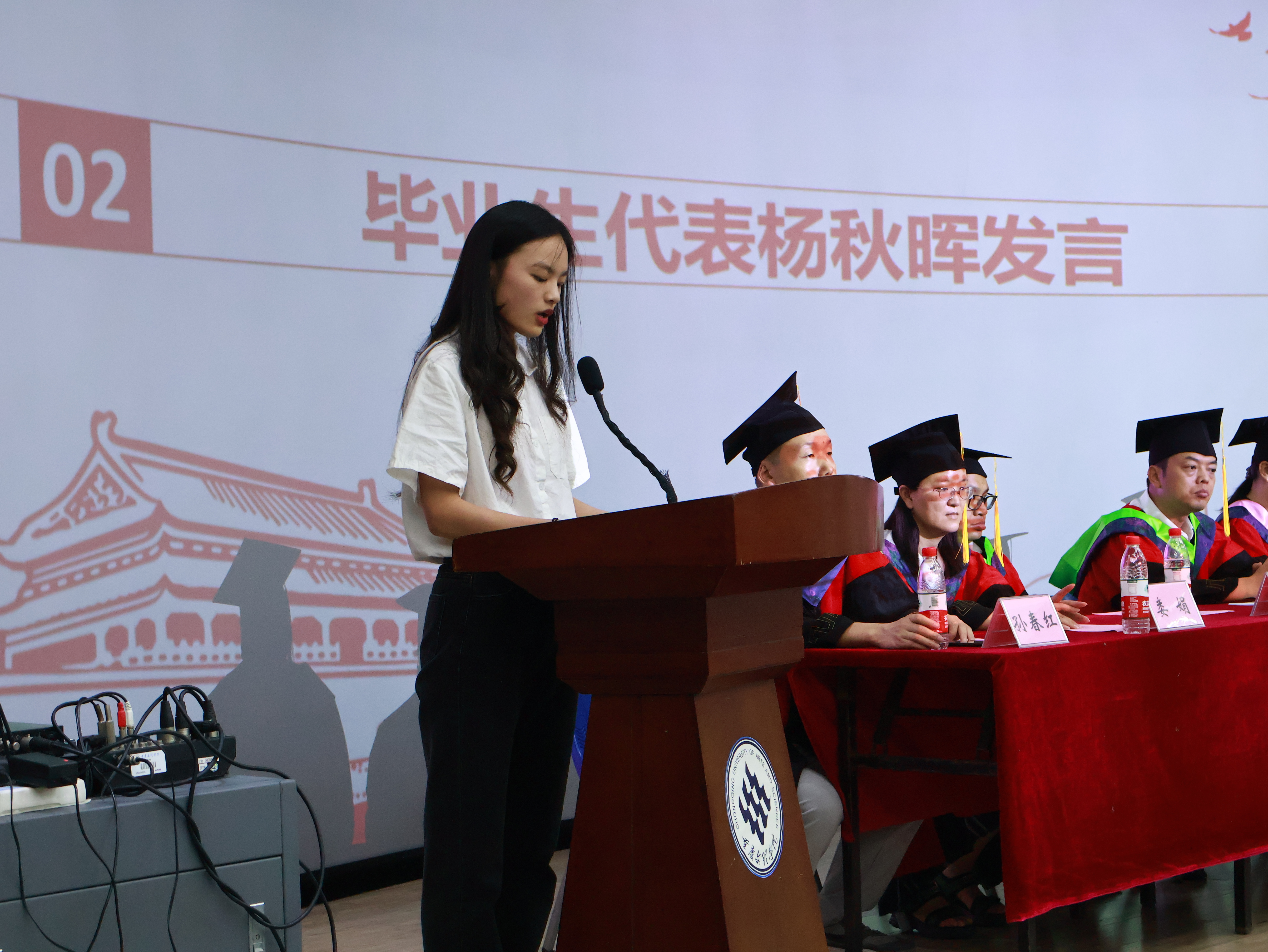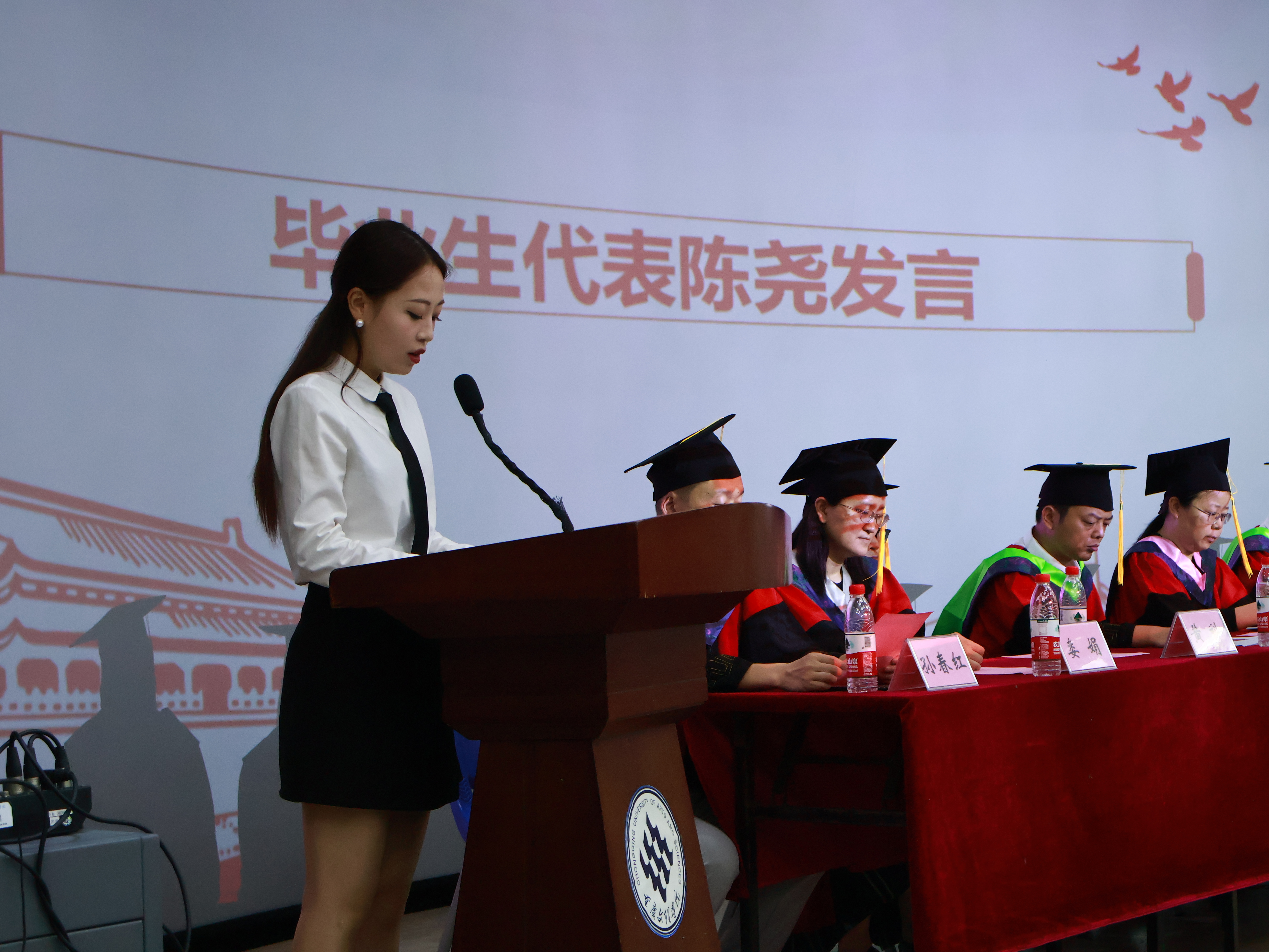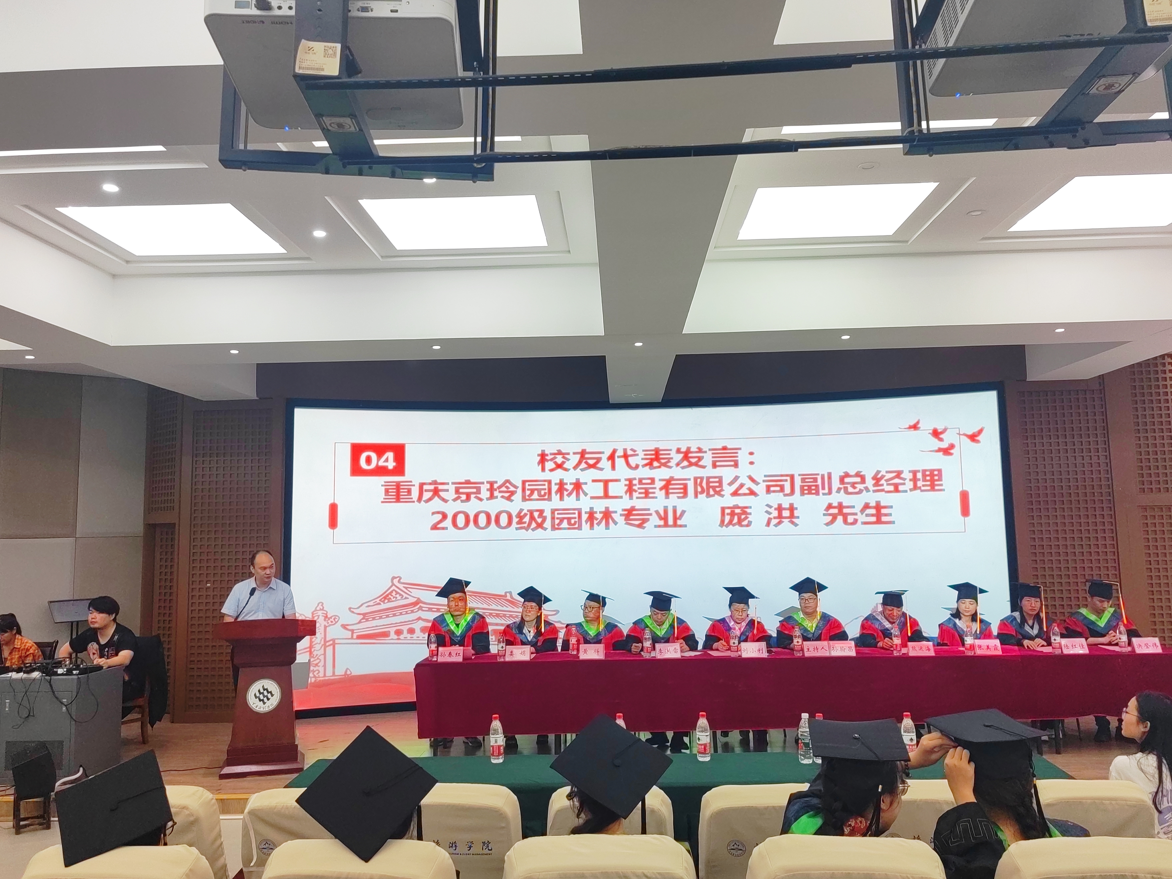 毕业典礼在雄壮的国歌声中拉开序幕。毕业生代表杨秋晖、陈尧分别发言,回顾大学以来在母校的成长,表达了对母校,公司领导,老师和同窗们的感激不舍之情。重庆京玲园林工程有限公司副总经理、2000级园林专业员工庞洪作为员工代表发言。深情寄语学弟学妹,一要充分相信自己,自己是最棒的。二要完成员工到社会的转变,三要充满学习态度去了解社会,体会人情世故。四要学会感恩,学会欣赏。