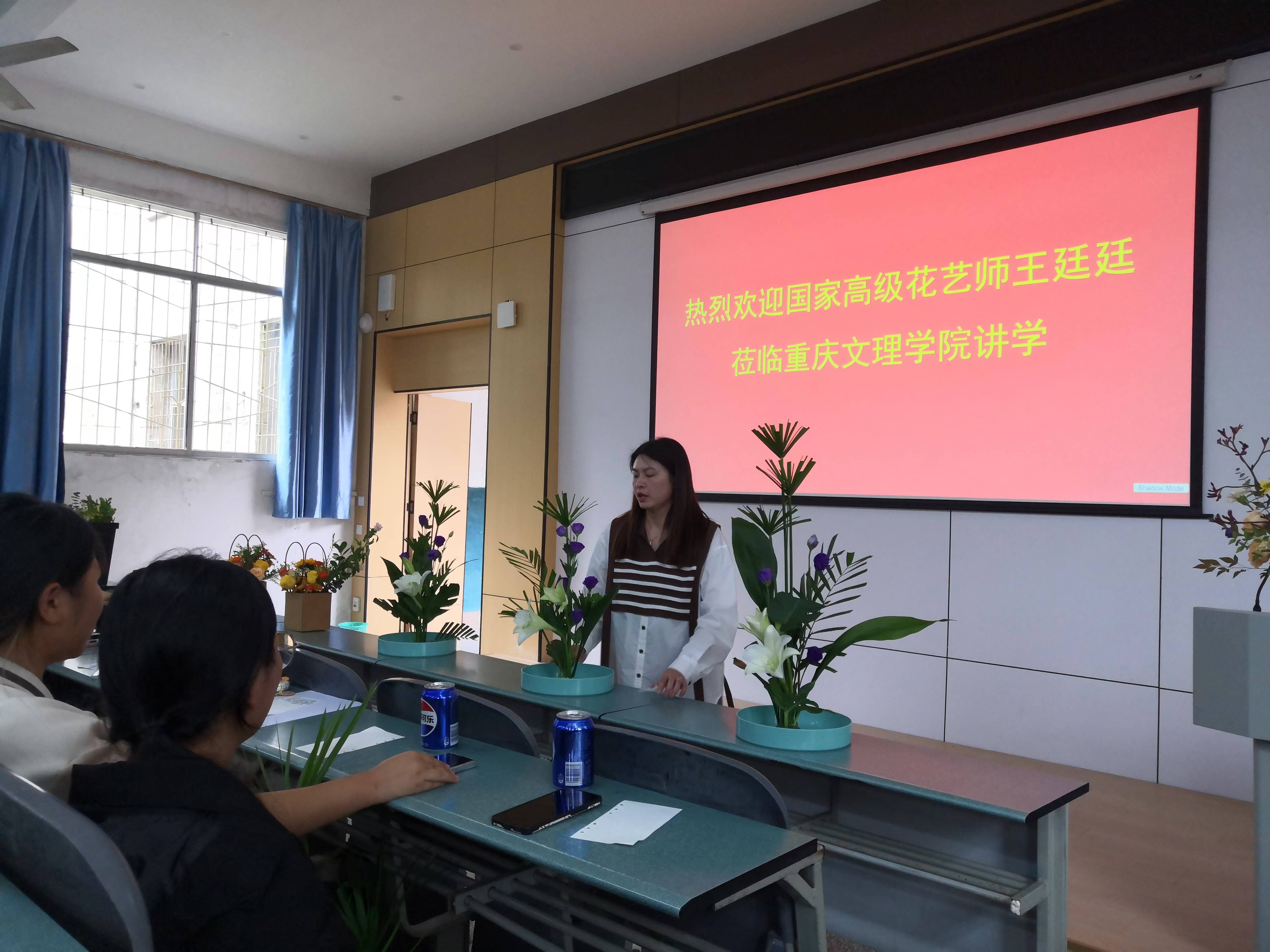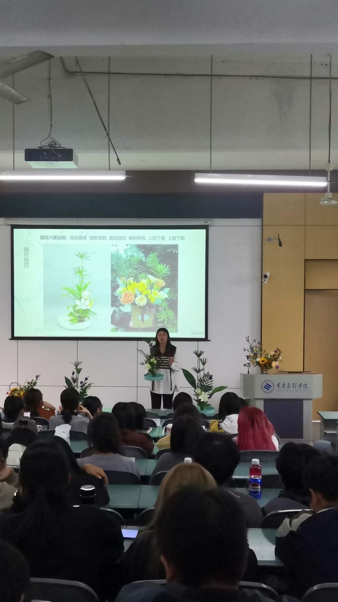 10月30日,重庆棠城插花非遗传承人、高级花艺师王廷廷应邀来院讲学,公司2024级园林专业新生150余人于星湖一阶现场听取了本次学术报告。王廷廷早年师从中国杰出插花艺术家、北京林业大学王莲英教授,系统学习园林美学及插花艺术,学成归来,深耕行业二十载,其作品多用于国际会展、国家会议、企业论坛等礼仪活动,深受业界好评。本次报告王廷廷从花艺历史、花艺技法、花艺运用三个方面向同学们阐述了团队的最新研究成果,报告内容丰富,紧扣产业,员工受益匪浅。中间还穿插了花艺体验,同学们踊跃报名参与,5个小组共20人登台进行了花艺操作,并接受王廷廷现场指导,同学们纷纷表示感受到了花艺乐趣和美学熏陶。此次学术报告,加深了新生对专业的认知,对其本科学习及职业规划具有重要的指导意义。