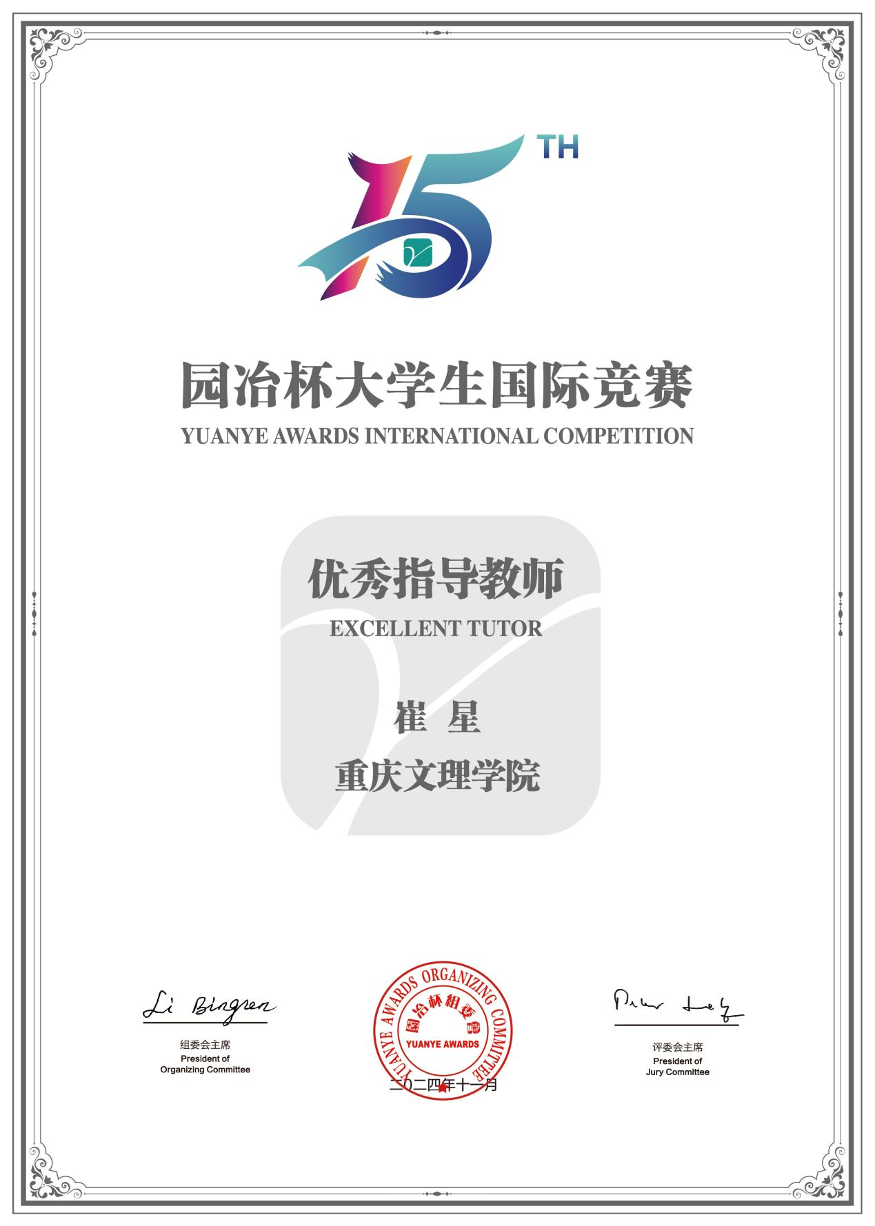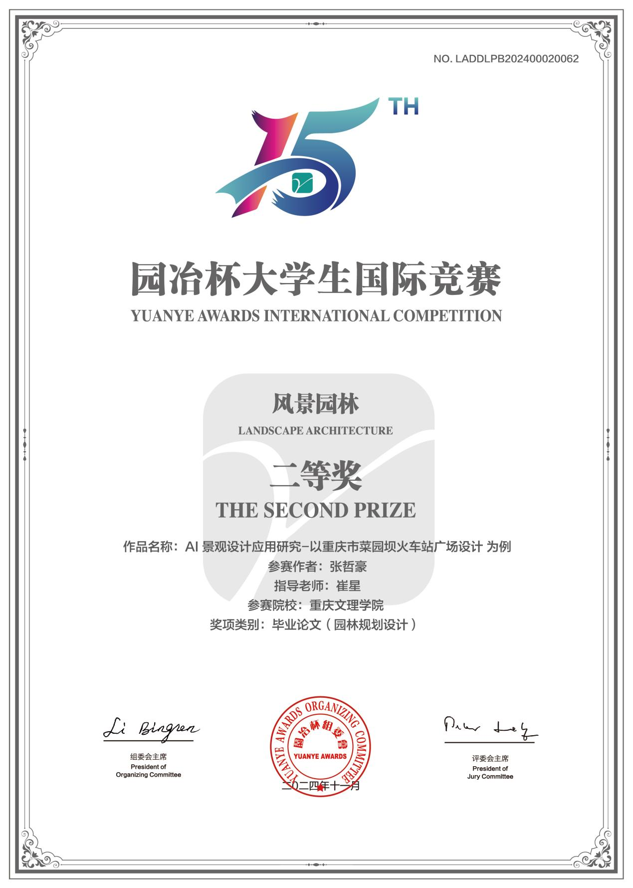 近日,在第十五届园冶杯老员工国际竞赛中公司2020级园林专业员工张哲豪毕业设计《AI景观设计应用研究-以重庆市菜园坝火车站广场设计为例》荣获二等奖,崔星被评为优秀指导教师。本次竞赛共收到作品3443件,经由园冶杯秘书处的严格审核与专家团队的初步评定后,210件作品进入复审阶段。