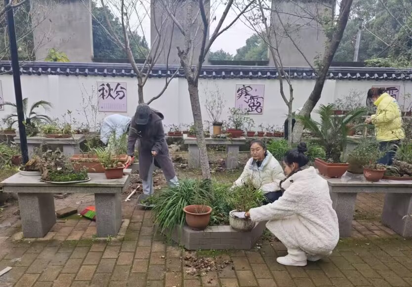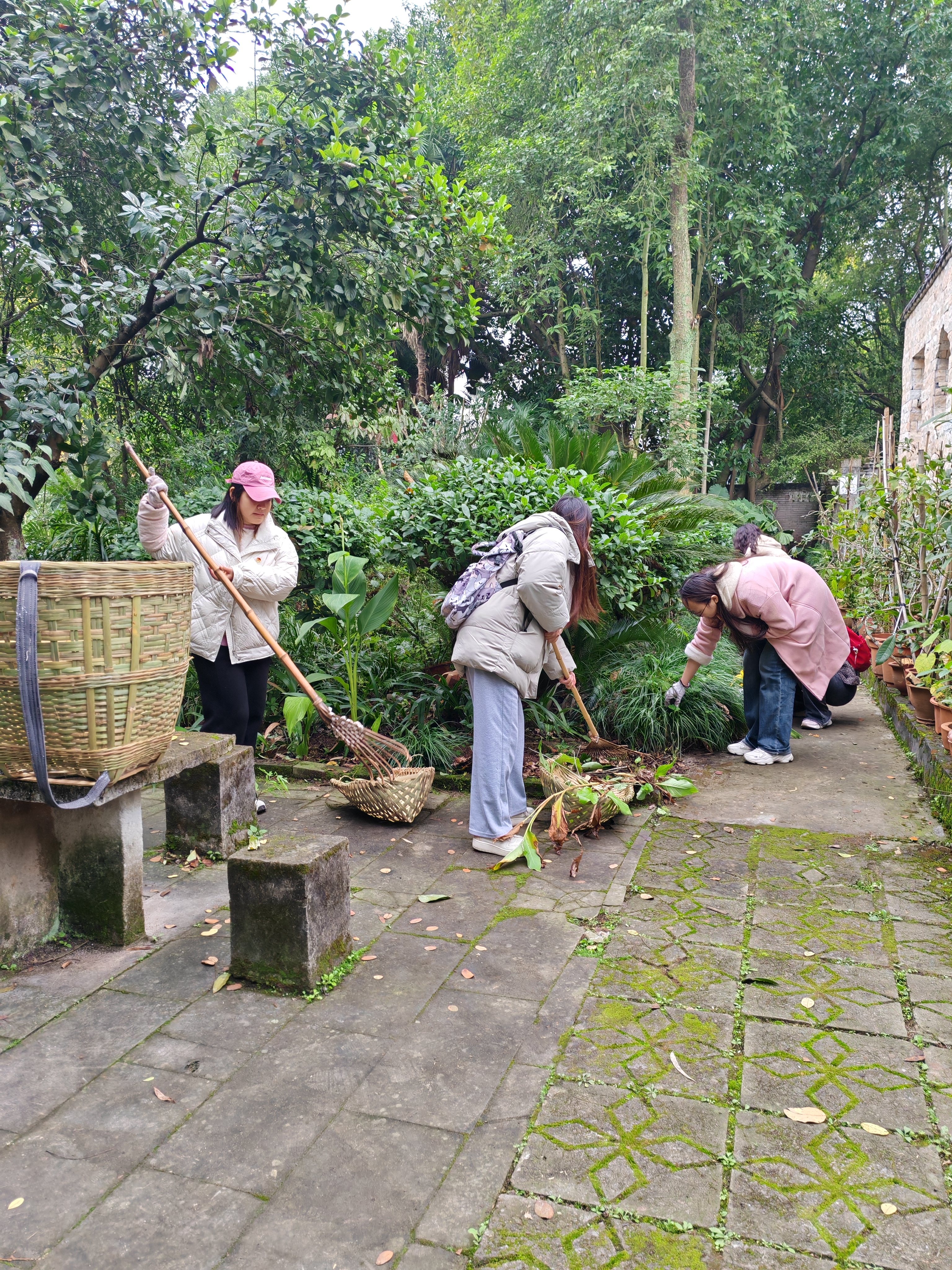 在指导老师带领下,同学们兵分五组。他们手持扫帚、撮箕,将园内的垃圾、落叶等清扫干净,用手搬动摆放不整齐的盆栽植物,清除花镜设计作品周边的杂草杂物,用实际行动诠释着对美好环境的热爱与珍惜。