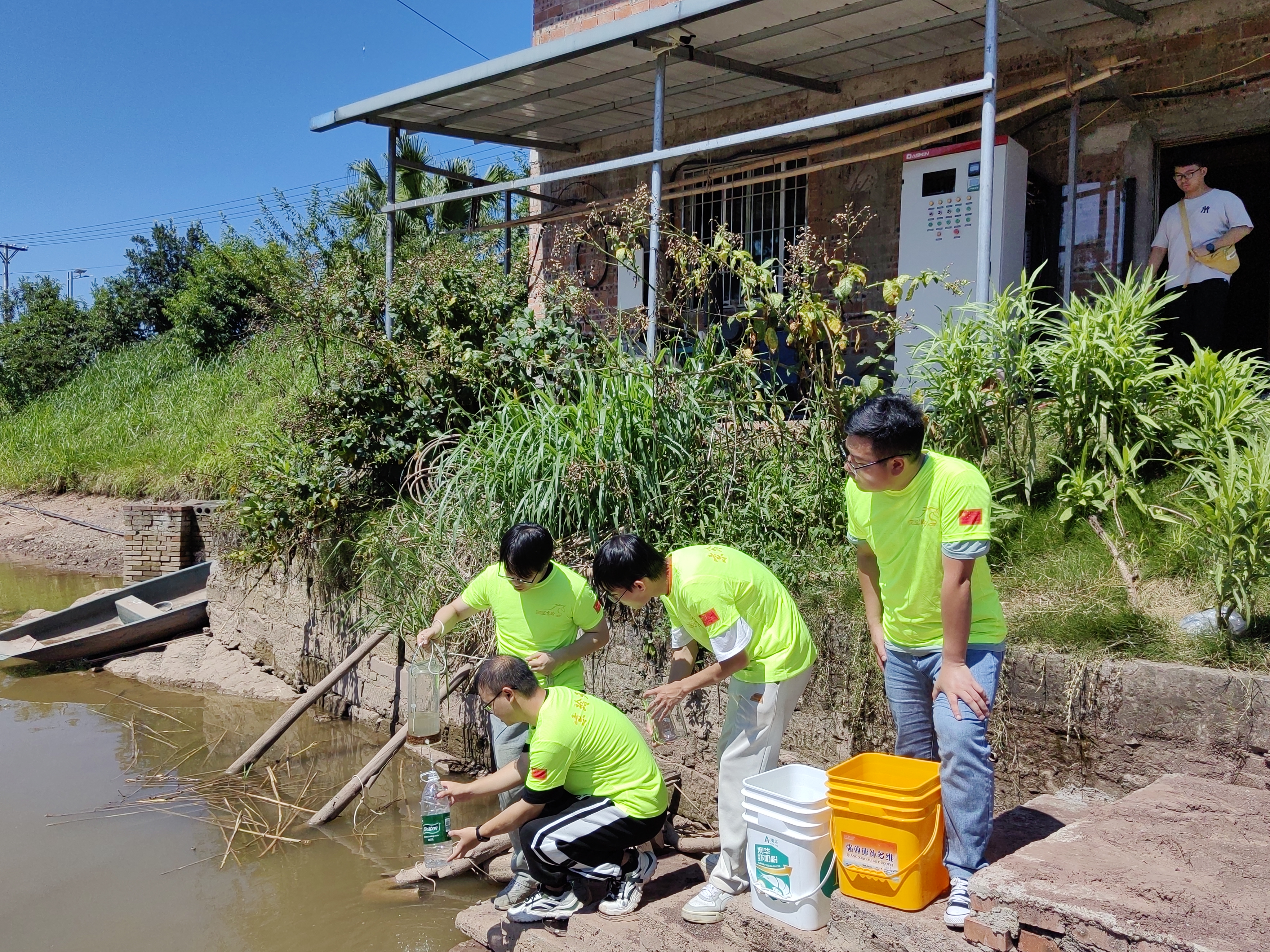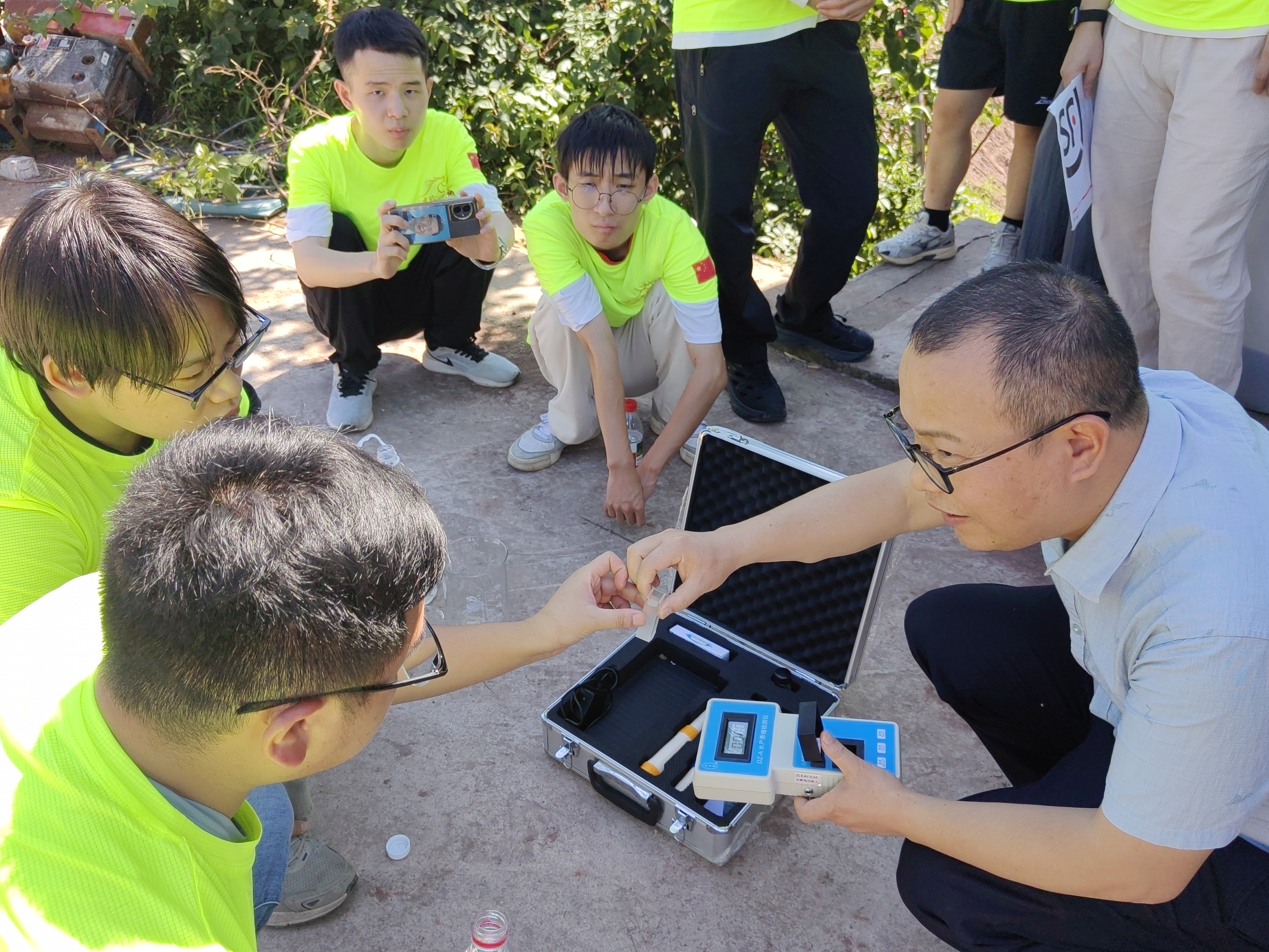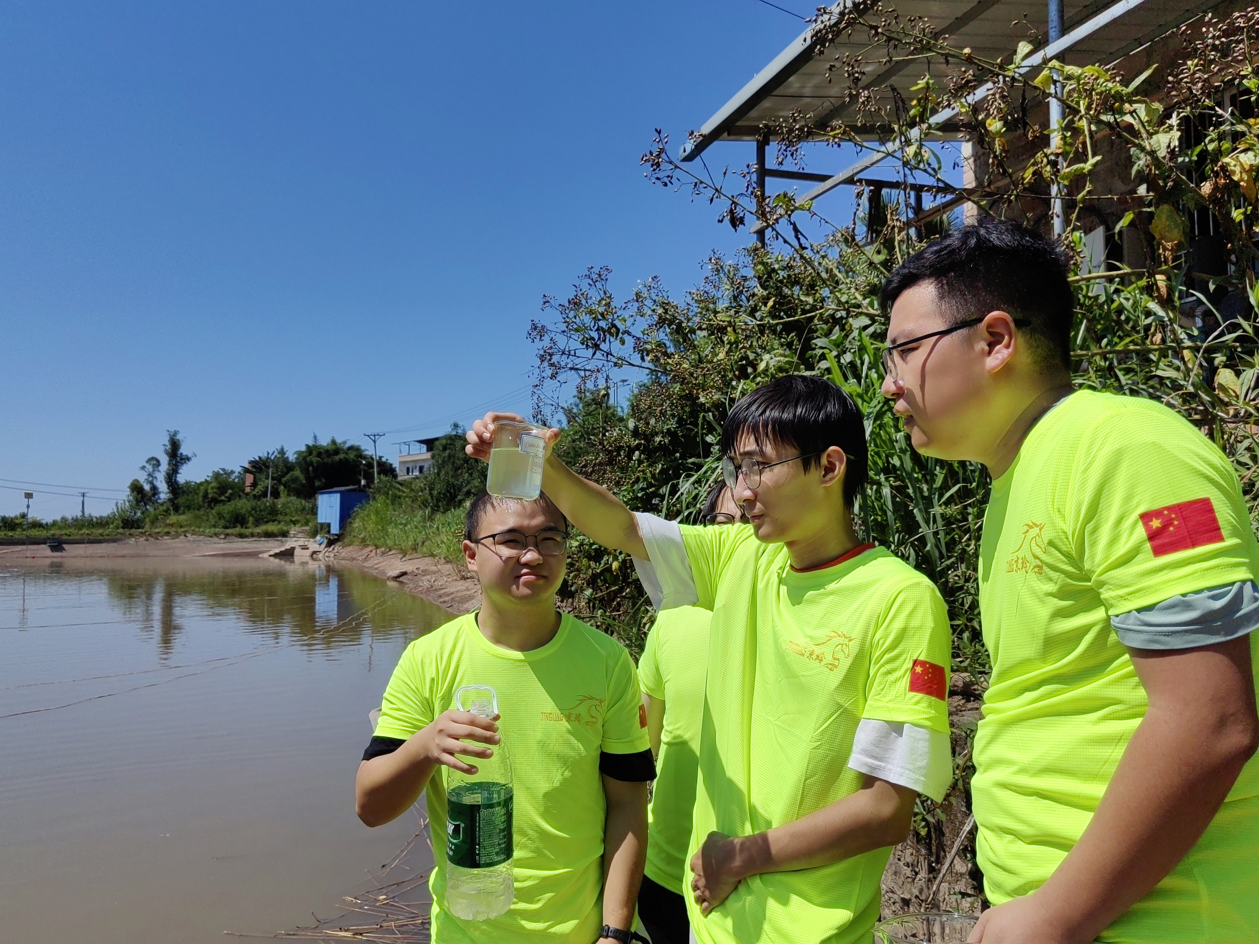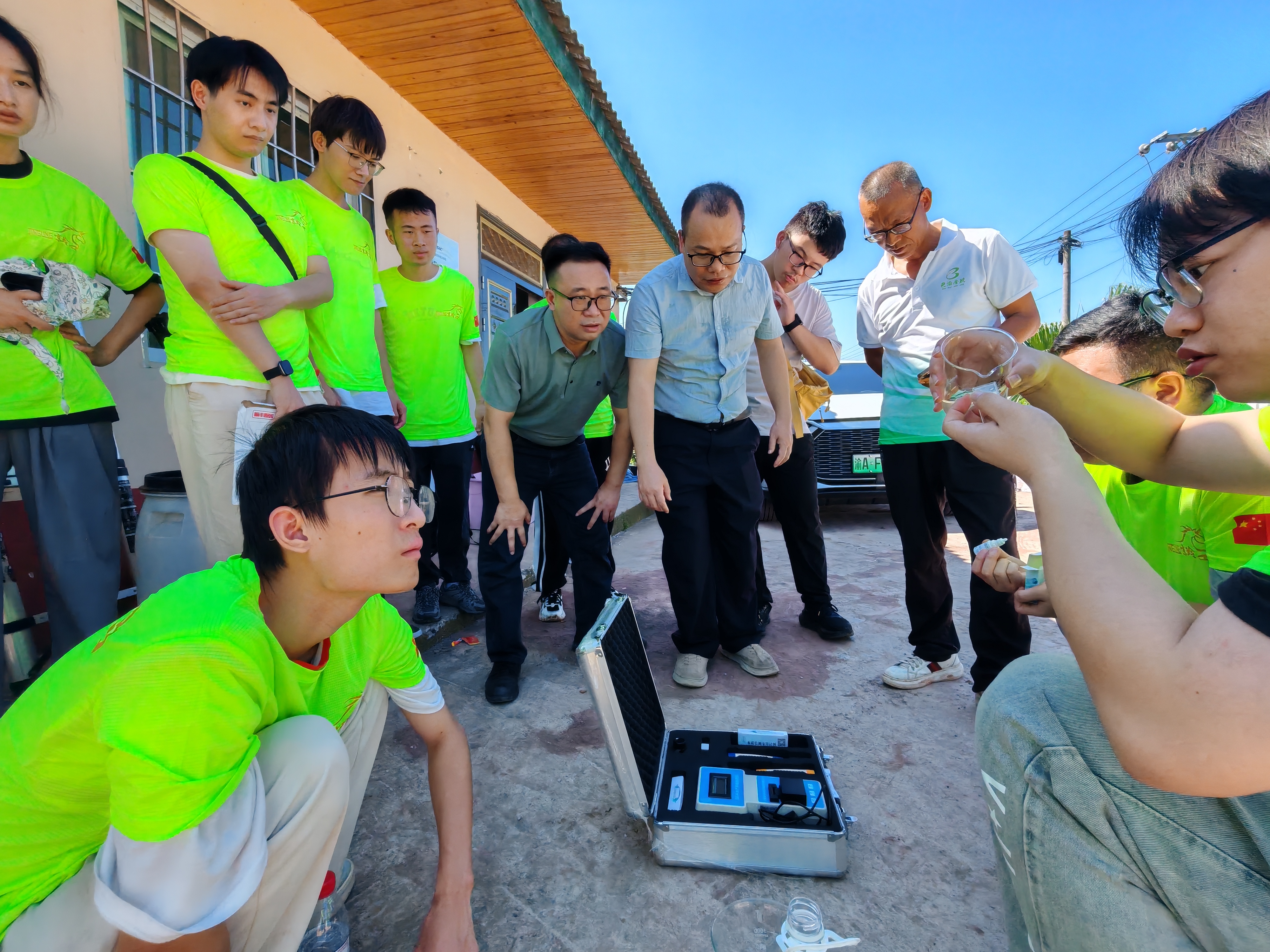 在公司池塘养殖现场,实践团队师生们充分利用“田间课堂”这一鲜活平台,将理论知识与一线实践紧密结合。公司党委副书记、纪委书记孙翰昌教授讲解了水样取样的科学规范与关键要点,具体示范、指导员工进行实际操作。随后,师生们手持便携式水产养殖检测仪,检测并详细记录pH值、盐度、亚硝酸盐等核心水质指标,直观反映池塘生态系统的状态。同时,师生们结合所学专业知识和现场观察,与公司技术专家共同探讨,针对夏季高温期间水质净化以及可能存在的水环境与食品安全风险,提出了建设性意见。