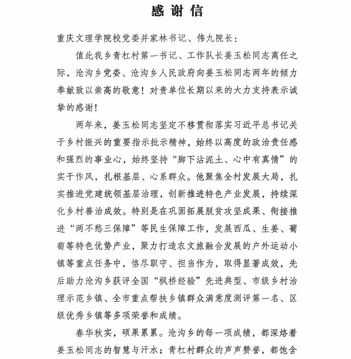 感谢信指出,姜玉松同志贯彻乡村振兴指示,以高度的政治责任感和实干作风,扎根基层,心系群众。他推进党建引领基层治理,创新特色产业发展,在巩固脱贫成果、发展特色产业、打造农文旅小镇等任务中成效显著。