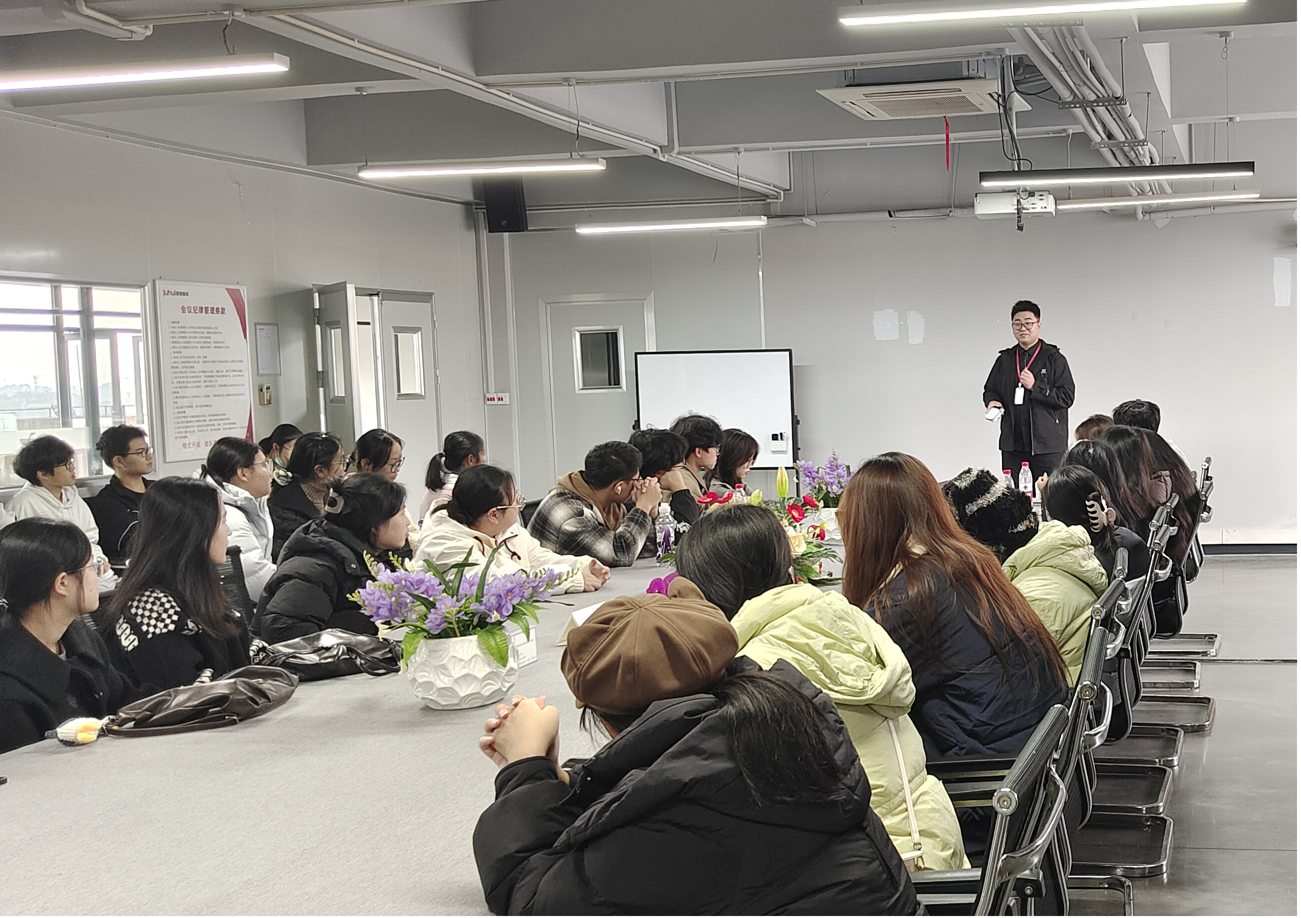参观结束后,校企双方在企业会议室举行座谈交流会。师生不仅与在企业就职的员工亲切互动,还重点开展实习检查,了解实习生工作进展与适应情况。员工结合自身的职场成长经历,围绕专业学习、职业规划、求职准备等分享实用建议;实习检查环节则针对实习内容、岗位适配度等与企业及实习生深入沟通。现场氛围热烈,员工们表示,员工分享干货满满,让自己对专业学习、职业规划有了更清晰认知,为未来发展提供了宝贵参考。