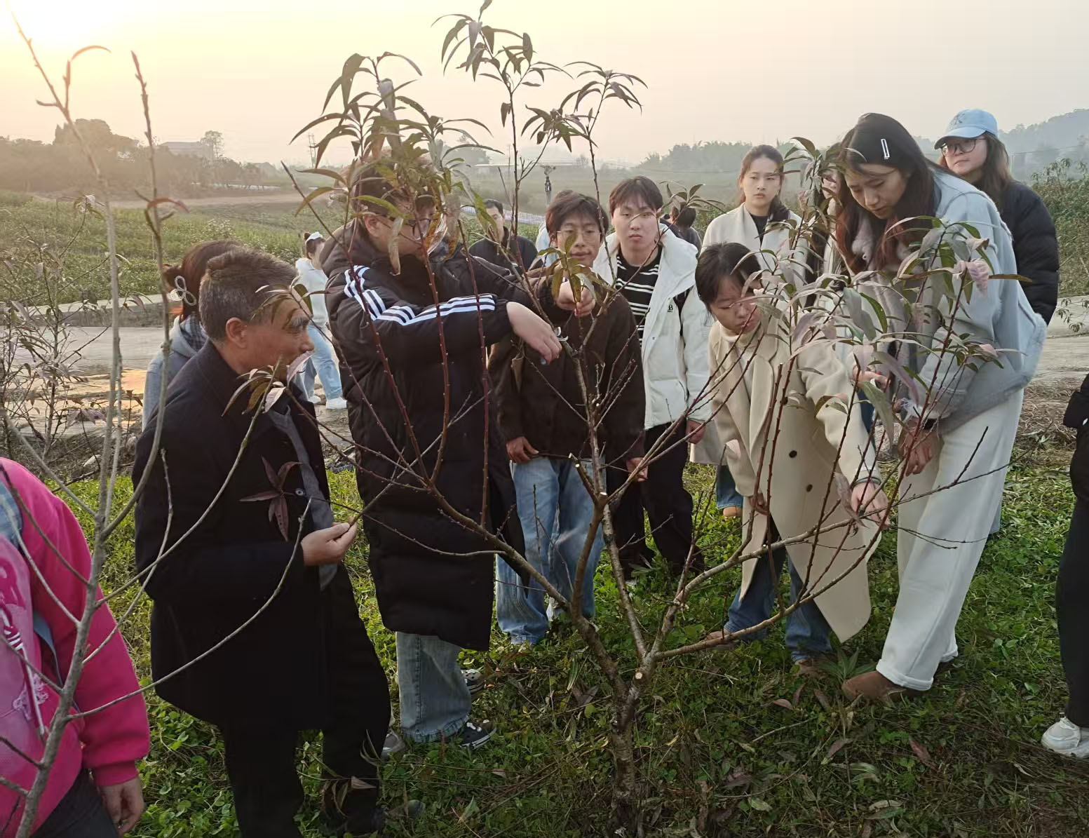 活动中,黄科教授系统讲解了种苗组培实验室研究与工厂化繁育的技术差异,重点剖析了培养基配制、高压灭菌、继代培养等环节的产业化应用逻辑,强调“实验室是探索规律的‘望远镜’,工厂化生产是验证价值的‘试金石’”。陈贵虎总经理结合30余年果树种植经验,围绕新品种引种、杂交育种、嫁接修剪及脱毒繁育等关键技术展开分享,并以“案例+实操”方式指导员工完成桃树、柑橘树冬季修剪,让书本知识转化为田间技能。