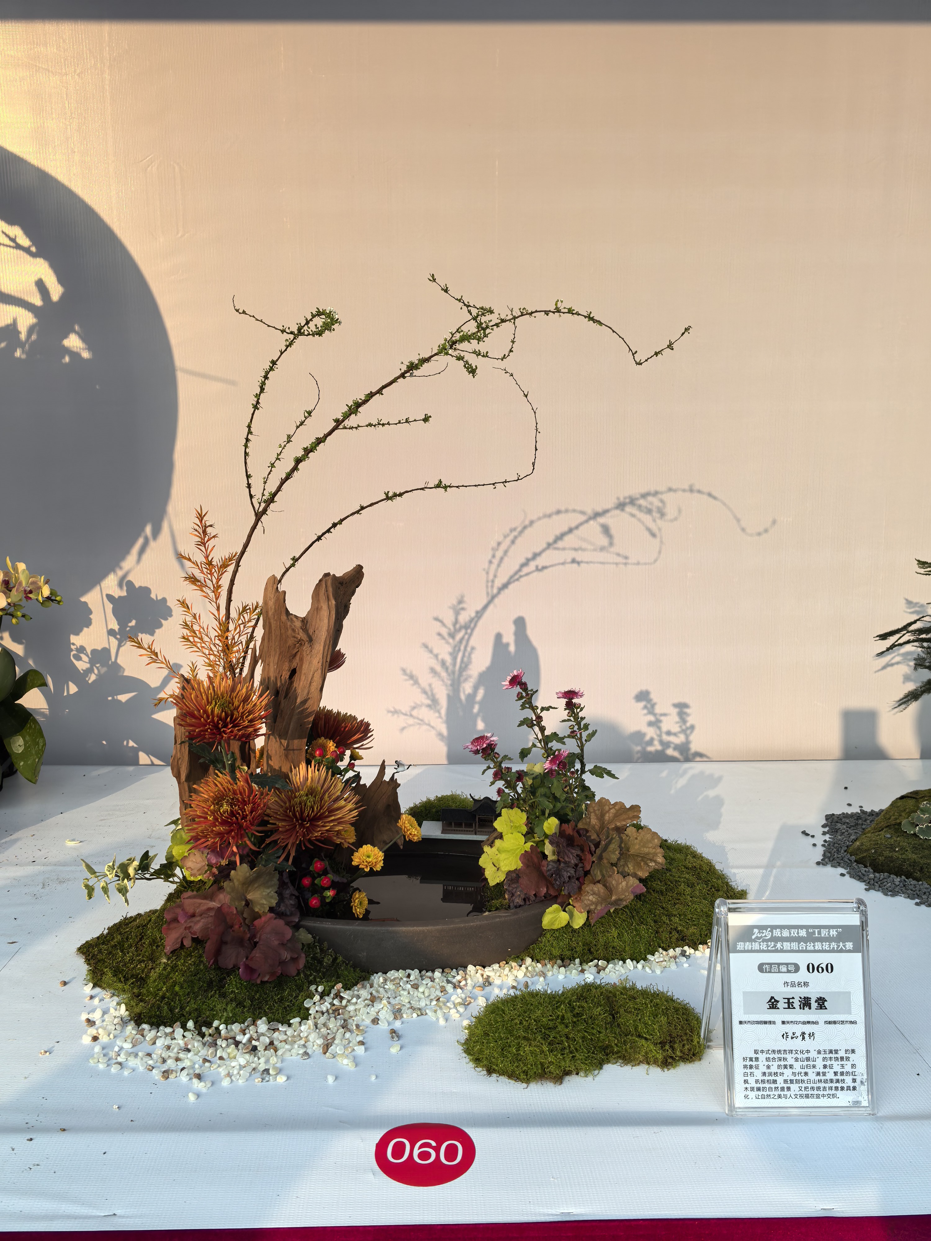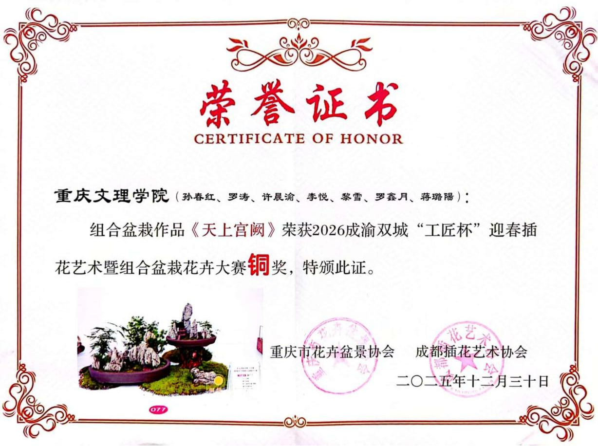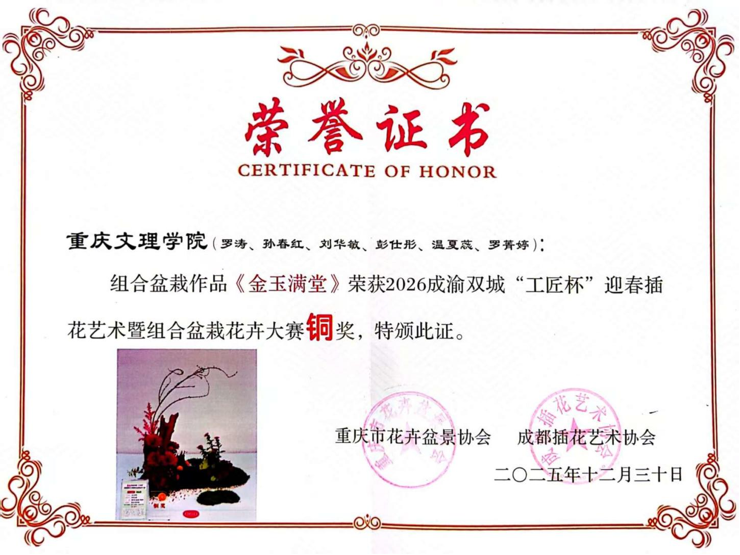 经参赛选手自荐、所在单位推荐及协会专家严格审核,最终遴选出插花艺术作品54件、组合盆栽作品38件,共计92件精品佳作入围决赛。公司积极组织参与,选派4支队伍同台竞技。比赛现场,参赛师生不畏强手、精益求精,高质量完成了4件参赛作品。经评审,最终斩获2项铜奖,成为本次大赛所有参赛高校中唯一获得两项奖项的院校。